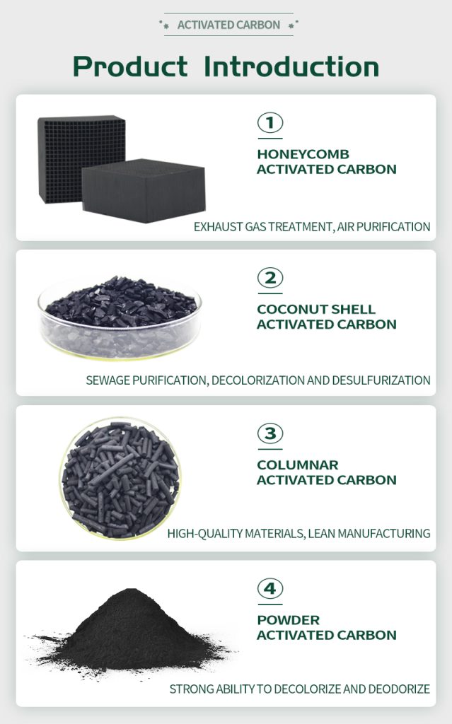 • Indoor Air Purification: (Honeycomb, Coconut Shell) Used in HVAC systems and air purifiers to remove formaldehyde, VOCs, and smells.